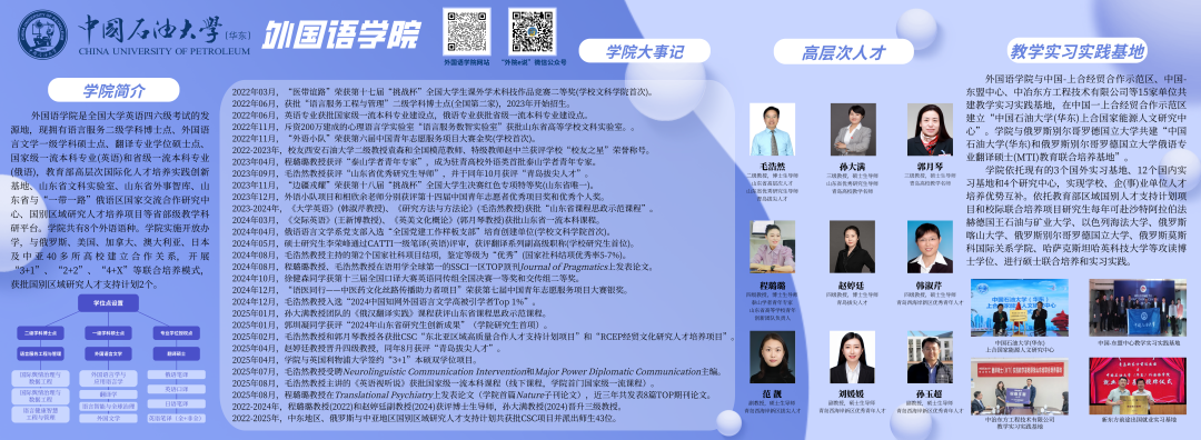 同时,在这么强的学校平台中,我们学院还得努力在夹缝中求生存谋发展。学校会问我们是如何赋能中国特色能源领域世界一流大学建设的?我们必须跟学校“服务能源、双轮驱动”的战略相一致。一方面在公共外语维度(比如学术英语教学、学术英语写作中心、通识教育、外语角)有效赋能全校本硕博能源学术外语,在语言服务、国际传播、区域国别、国际组织等领域有效赋能学校能源战略。