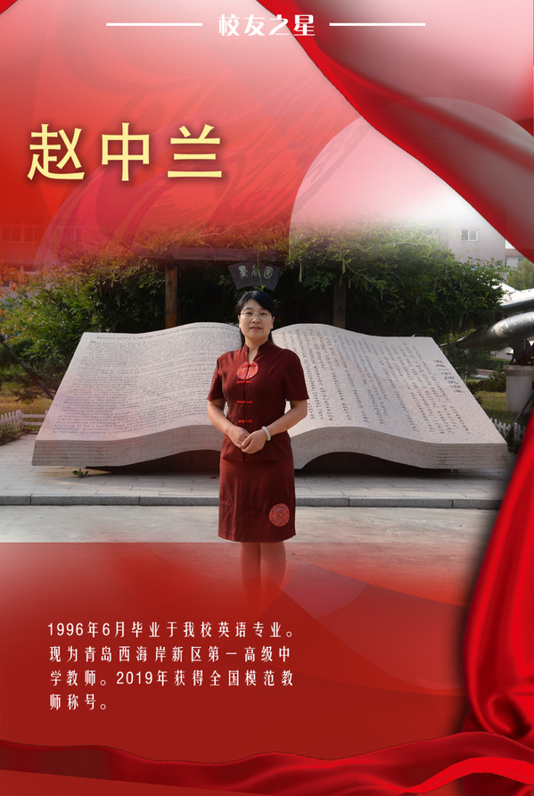赵中兰,中共党员,高级教师。1996年毕业于石油大学(华东)外语系英语专业,先后在乡镇、县城工作过,任教过初中、高中英语,担任过班主任、年级主任,2021年9月通过人才引进到新区工作。从教26年,始终抱朴守拙,追求卓越。教育教学成绩屡次得到学校及上级主管部门的肯定和嘉奖。英语教学方面,得益于母校培养的扎实英语素养,始终把英语教学作为立身之本,习于智长,精益求精。先后获得过市优质课一等奖,全国中学(高中)英语教学观摩研讨会优质课比赛全国二等奖。先后主持多项省市级教育教学课题。2014年被外研社聘为教材培训专家。先后被评为市学科带头人,市教学能手。2019年入选第四期齐鲁名师建设工程人选,是2020-2022年度山东省“互联网+教师专业成长”建设工程省级工作坊主持人。连续多年获教育主管部门颁发的优秀人才培养突出贡献奖。荣获市巾帼十杰、三八红旗手,市最美教师,市有突出贡献中青年专家。2017年被推选为山东省第十一次党代会代表。2019年被人社部教育部联合表彰为全国模范教师。