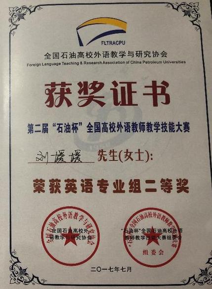 5. 刘媛媛,2017.07,第二届“石油杯”全国高校外语教师教学技能大赛英语专业组,国家级二等奖