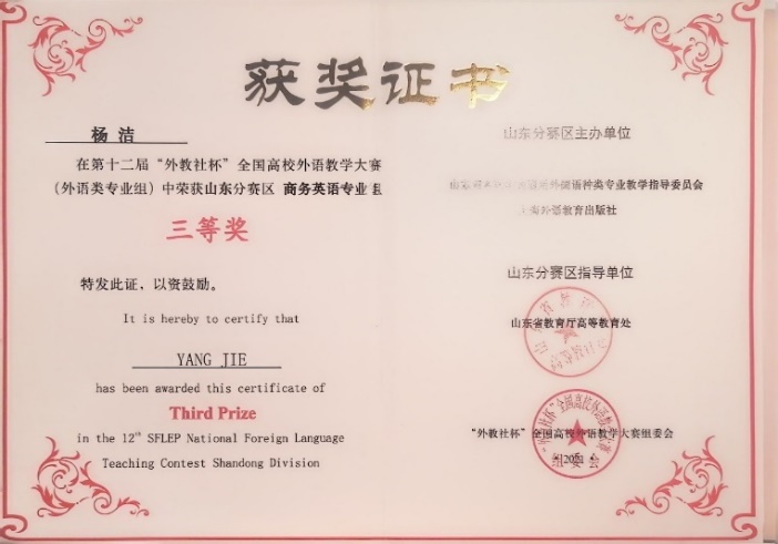 7. 杨洁,2021.05,第十二届“外教社杯”全国高校外语教学大赛(外语类专业组)山东省分赛区商务英语专业组,省级三等奖