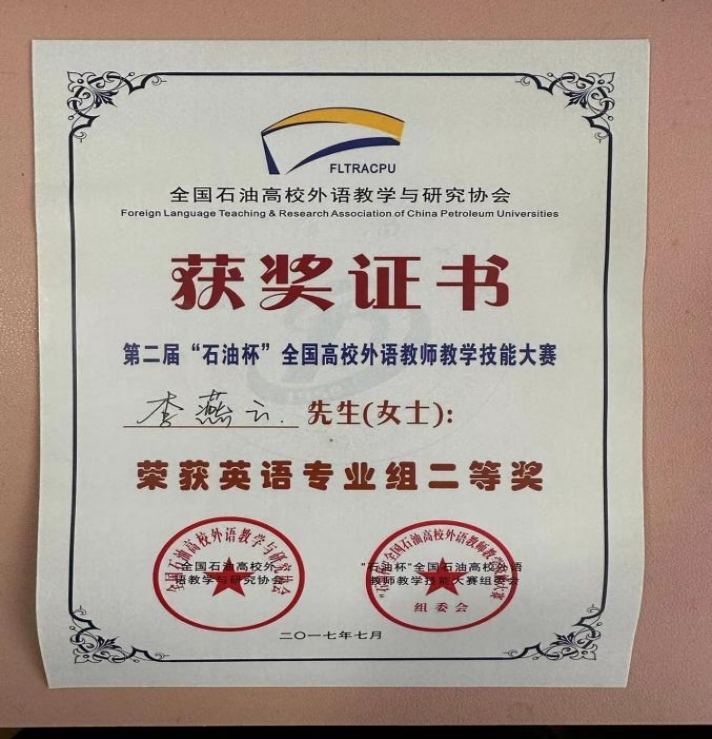 4. 李燕云,2017.07,第二届“石油杯”全国高校外语教师教学技能大赛英语专业组,省级二等奖