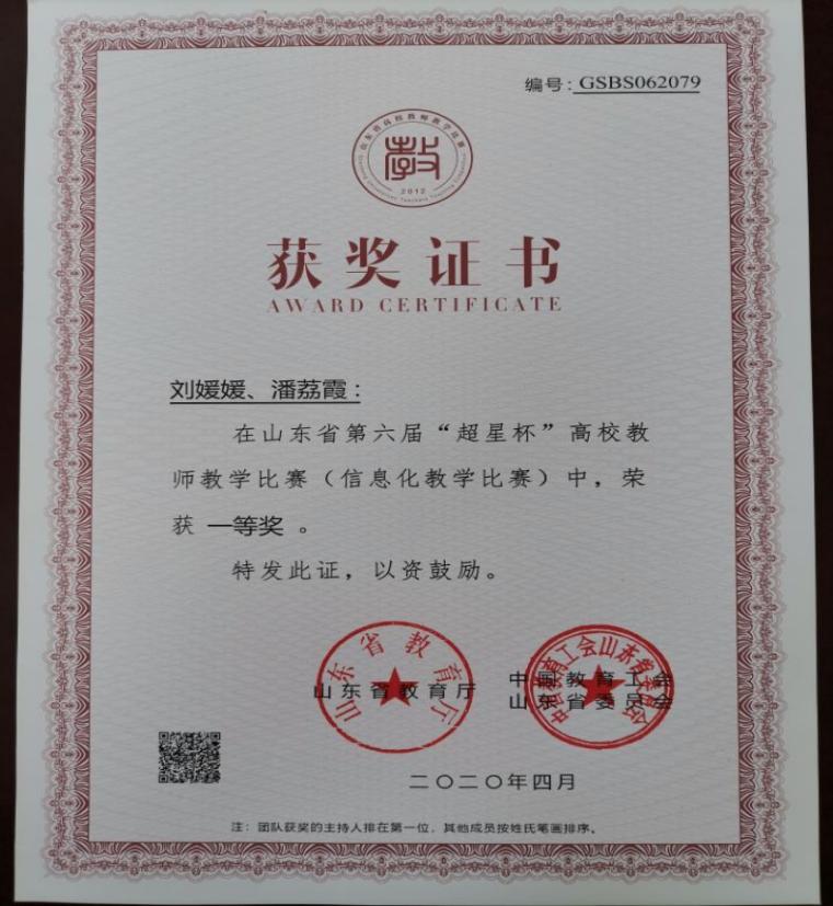 1. 刘媛媛、潘荔霞,2020.04,第六届山东省信息化教学大赛,省级一等奖