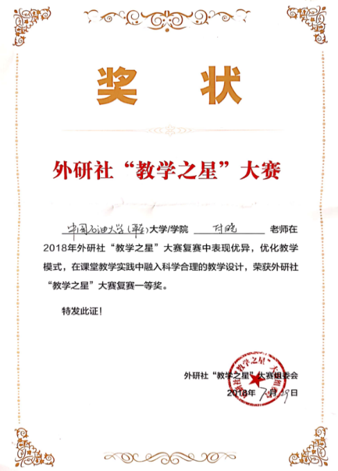 2. 付晓,2018.07,第五届外研社全国“教学之星”大赛英语专业组复赛,省级一等奖