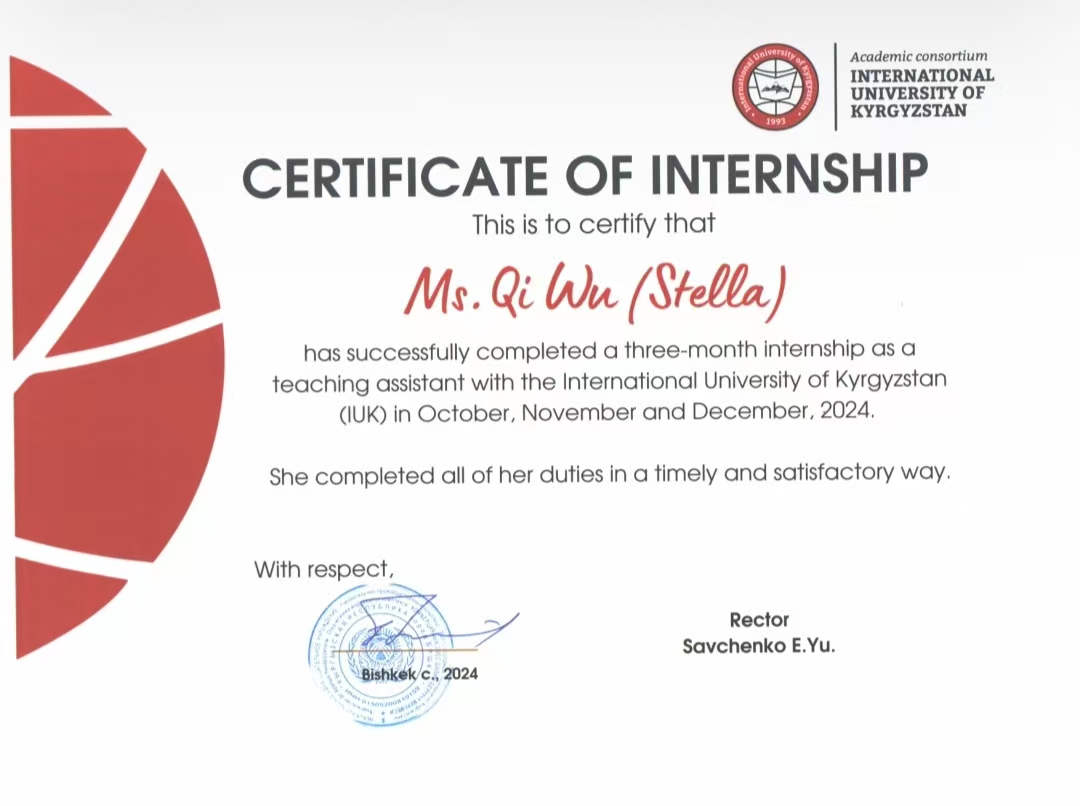 7.吴绮,2024.10-12,吉尔吉斯斯坦国际大学学术联合会,国际组织远程实习项目