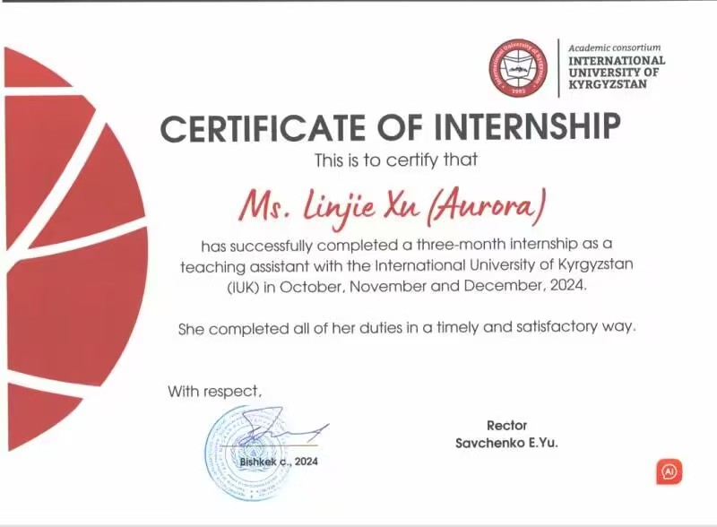 6.徐林洁,2024.10-12,吉尔吉斯斯坦国际大学学术联合会,国际组织远程实习项目