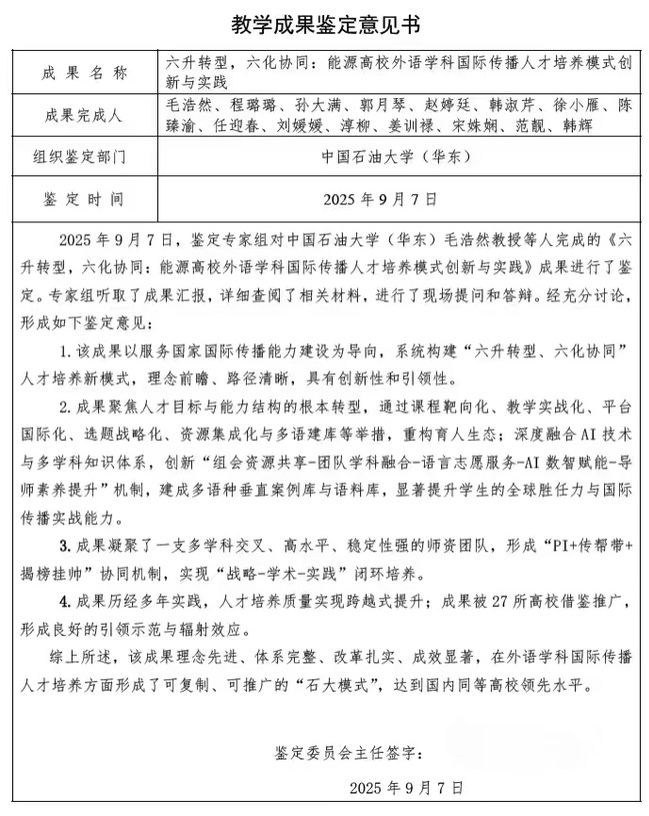 2025年9月3日,鉴定专家组对太阳集团网址8722毛浩然教授等人完成的《六升转型,六化协同:能源高校外语学科国际传播人才培养模式创新与实践》成果进行了鉴定。专家组听取了成果汇报,详细查阅了相关材料,进行了现场提问和答辩。经充分讨论,形成如下鉴定意见: 一、成果直面国家国际传播战略与外语学科转型的核心痛点,体系设计科学,育人理念领先 该成果精准切中国际传播人才“小才拥挤、大才难觅”和“有理说不清、说了传不开”的现实瓶颈,以服务国家国际传播能力建设为导向,系统构建“六升转型、六化协同”人才培养新体系,实现从“工具性+人文性”向“战略性+科学性”的范式跃升,理念前瞻、战略清晰,具有显著创新性和引领性。 二、“六升六化”机制系统协同,培养路径创新,改革举措扎实 “六升”聚焦人才目标与能力结构的根本转型,突破传统外语人才培养的低阶循环;“六化”通过课程靶向化、教学实战化、平台国际化、选题战略化、资源集成化与多语建库等举措,重构育人生态。尤其在“数智赋能”与“学科融合”方面,深度融合AI技术与多学科知识体系,创新“组会资源共享-团队学科融合-语言志愿服务-AI数智赋能-导师素养提升”机制,建成多语种垂直案例库与语料库,显著提升学生的全球胜任力与国际传播实战能力。 三、实践成效显著,辐射推广广泛,社会服务贡献突出 成果历经多年实践检验,人才培养质量实现跨越式提升:CATTI二级通过率从4.1%提升至28.6%,61人通过4个CSC项目赴海外开展田野调查,30余人进入国际组织实习;建成语言服务博士点及6个省部级平台;研发的孤独症语言障碍干预系统服务超5000人次;“语爱同行”“语医同行”志愿服务获国家级和省级金奖。成果被27所高校借鉴推广,形成良好的引领示范与辐射效应。 四、团队结构优化,协同机制高效,可持续发展能力强 成果凝聚了一支多学科交叉、高水平、稳定性强的师资团队,形成“PI+传帮带+揭榜挂帅”协同机制,依托多个省级科研与教学平台,实现“战略—学术—实践”闭环培养,具备持续发展、推广与迭代能力。 建议进一步加强对国际传播实效的长期跟踪与综合评价,持续优化“六化”协同机制、数智赋能和学科融合路径。 综上所述,该成果理念先进、体系完整、改革扎实、成效显著,在外语学科国际传播人才培养方面形成了可复制、可推广的“石大模式”,达到国内领先水平。专家组一致同意通过鉴定。