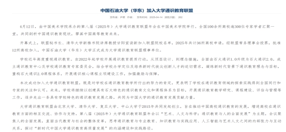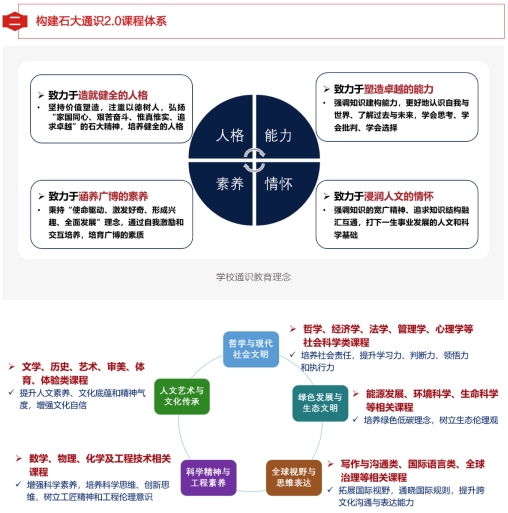 发布《关于深化通识教育提质行动暨开展首批“石大通识2.0”核心课程立项的通知》《关于开展第二批 “石大通识2.0”核心课程立项的通知》。规划分批建设50门左右的高阶高能通识精品课程。学校公布首批“石大通识2.0”核心课程立项名单,立项课程30门,人文艺术与文化传承模块课程7门,科学精神与工程素养模块8门,全球视野与思维表达模块3门。